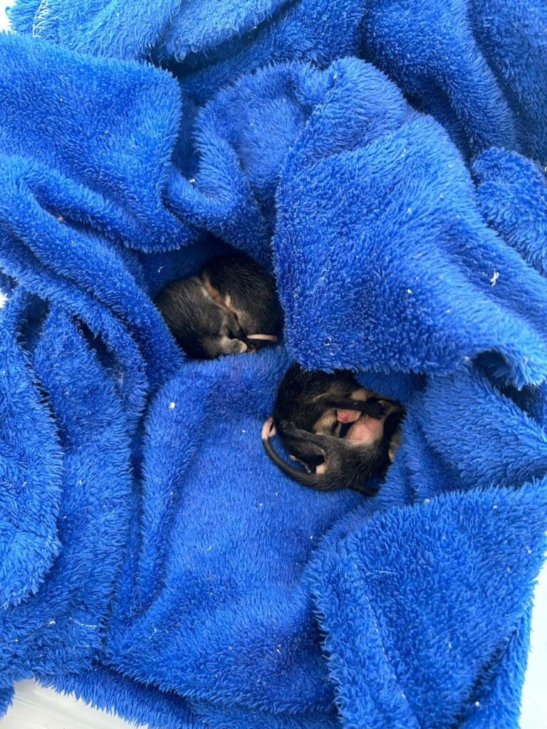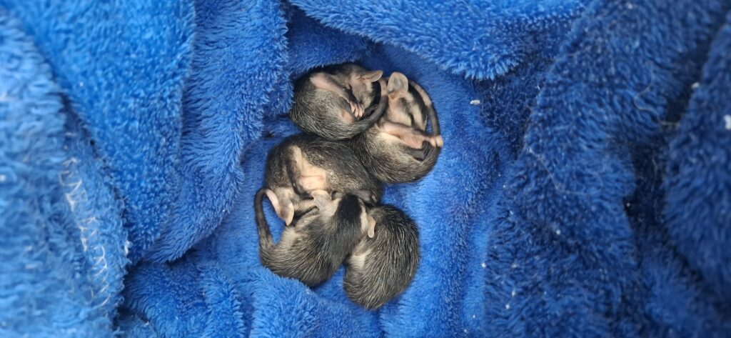 Para a pobre mamãe saruê, já era tarde. As moscas em volta de seu corpo já estavam afetando até os filhotes vivos. Era preciso agir rápido. Sabe lá o que tinha acontecido e, provavelmente, eles não aguentariam muito tempo. Voltamos para casa para nos equipar: luvas, máscaras, álcool, uma caixa de papelão para transportá-los e uma vassoura para puxá-los para fora (pois estavam portão adentro).